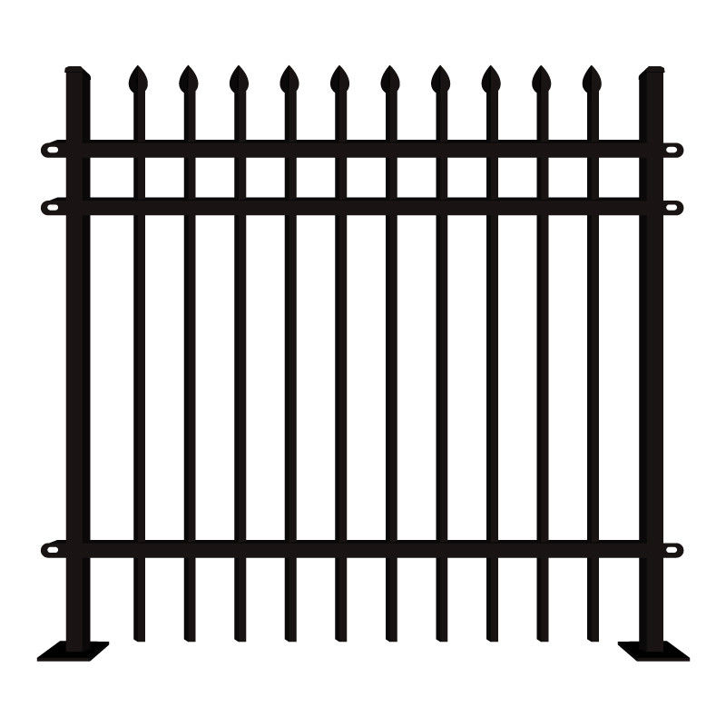 Steel Picket hek, ook wel bekend als garnizoen hek of buisvormige stalen hek, bestaat uit verticale buizen, horizontale rails, speerpunten,